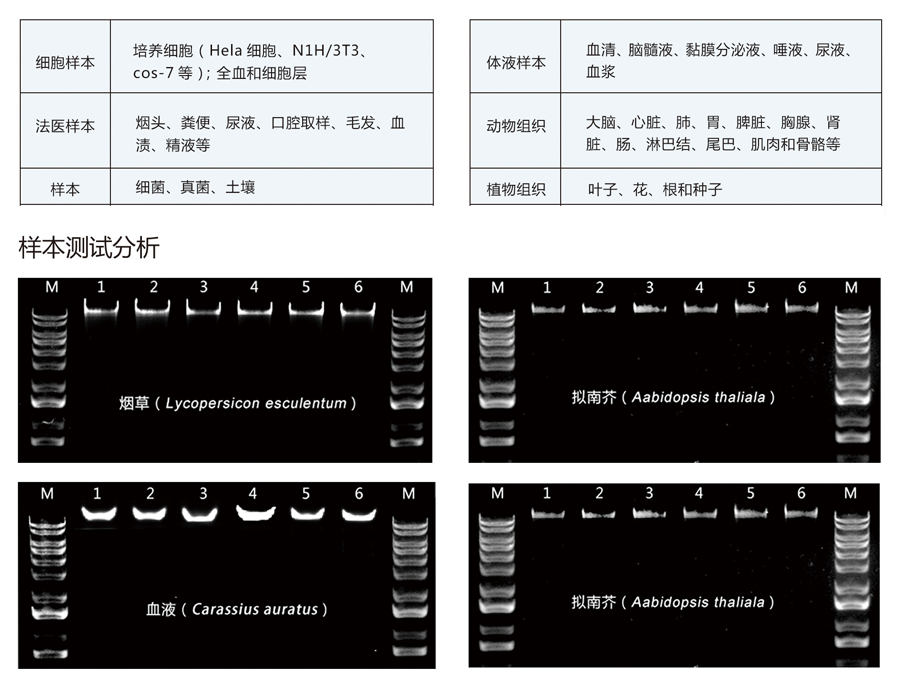 目前可供选择的配套试剂盒有:针对植物总DNA提取试剂盒、血液总DNA提取试剂盒、组织总DNA提取试剂盒、细胞总DNA提取试剂盒、细菌总DNA提取试剂盒、真菌总DNA提取试剂盒等。