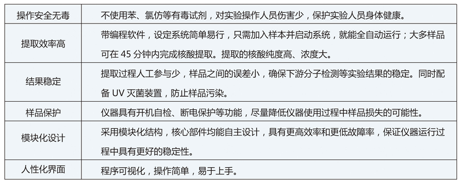 生物磁珠与核酸的特异性结合,使得提取的核酸样品纯度高、浓度大,并且由于生物磁珠纳米材料的特性,使得本系统对于痕量样品中核酸的提取与富集具有独特的优势。