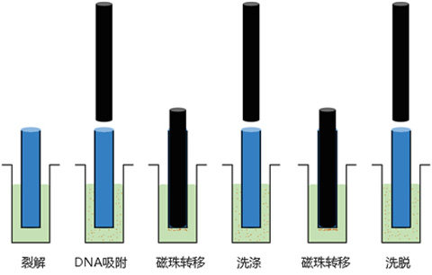 基于生物磁珠的核酸提取法是通过裂解液裂解生物样本后,利用功能性生物磁珠表面的功能基团,将核酸从裂解产物中富集生物磁珠表面,而蛋白质、糖类、脂质等杂质无法被富集,再利用磁棒将吸附携核酸的磁珠转移至洗涤液中,并移通过反复快速搅拌后进一步去除杂质,经过多步洗涤之后,在洗脱液中核酸与生物磁珠分离,获得最终的产物。